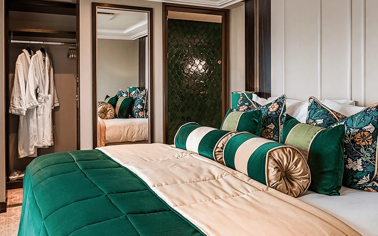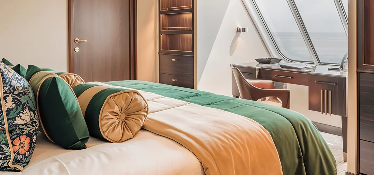“The Spirit of Discovery” is adorned with thousands of bespoke cushions, throws and bedspreads all made by Beaufort. The cruise ship’s owner & operator is SAGA who were delighted with what Beaufort produced, and the designers (SMC London) have been nominated for several design awards. We were delighted to have been involved. Beaufort also went on to manufacture the ‘softs’ package for Saga’s next ship “The Spirit of Adventure” which was designed by AD Associates.