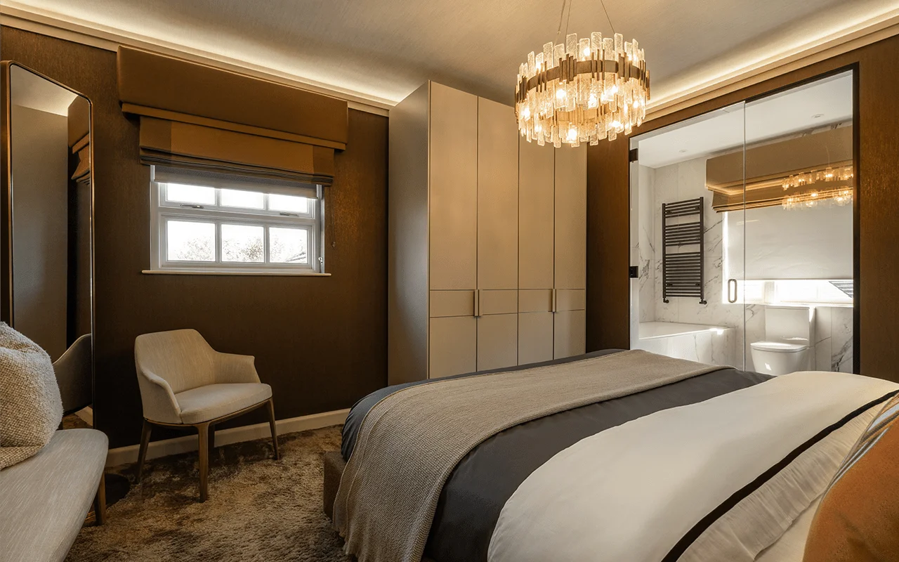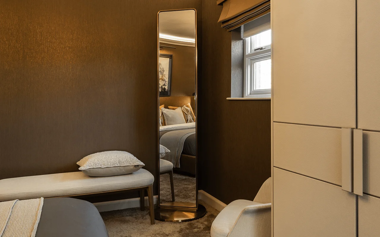 Our client was attracted to warmer tones, and a more modern styling with clean lines and variety of texture. We proposed Roman blinds with stepped pelmets and blackout rollers beneath rather than curtains on both windows; heavily textured scatter-cushions, bed throw, and a dark shaggy carpet that co-ordinates with the upholstered bedframe (with easy-to-use tip-up under-bed storage and adjustable slats). Even the doors of the wardrobe are covered in tecno-leather with embossed grain. Stepped coving around the ceiling hides decorative LED strip-lighting that emphasises the textured wallcovering on the ceiling, whilst the interior lighting of the wardrobe adds functionality, and the centre ceiling-fitting brings a touch of glamour.