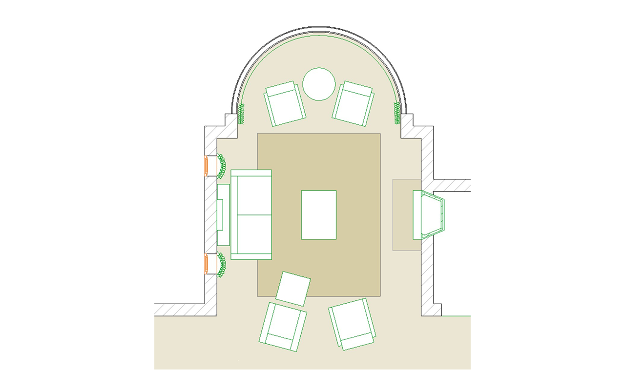 A bespoke deep-buttoned stool in the centre of the room was manufactured in house by the Beaufort production team, as were the scatter-cushions and window-dressings. The curtains have a large goblet heading and the primary fabric is “Octavia” by Designers Guild. The textured wallcovering is “minerals” by Omexco, and the large stepped circular mirror is from Jonathan Charles.