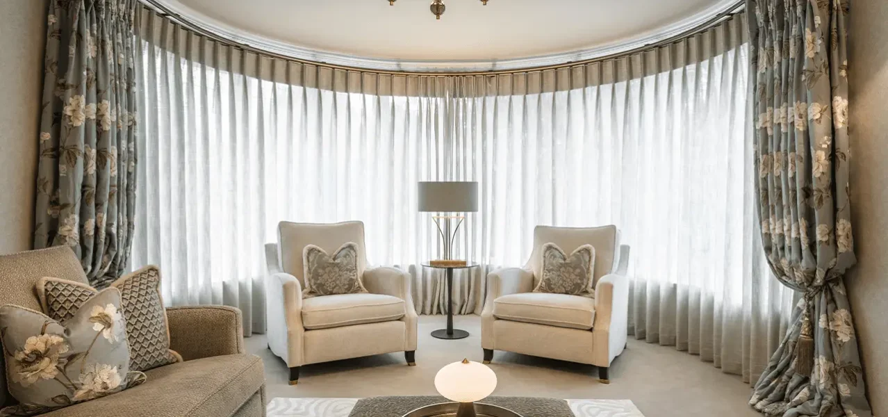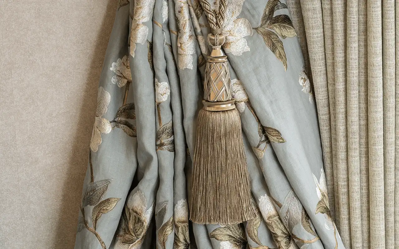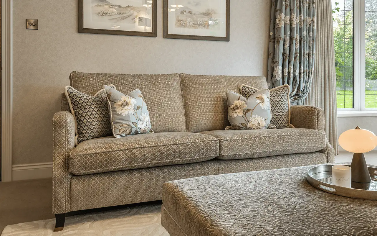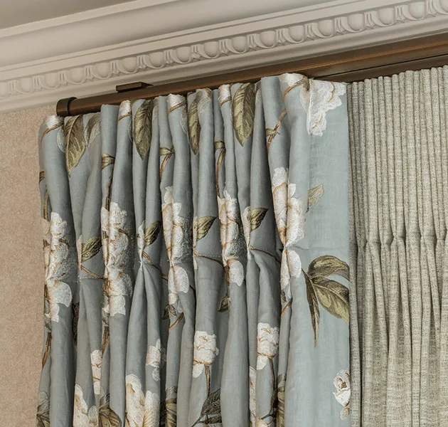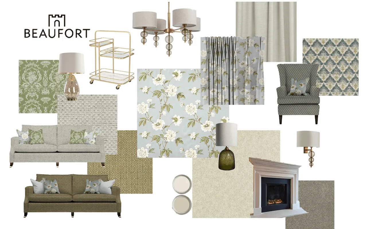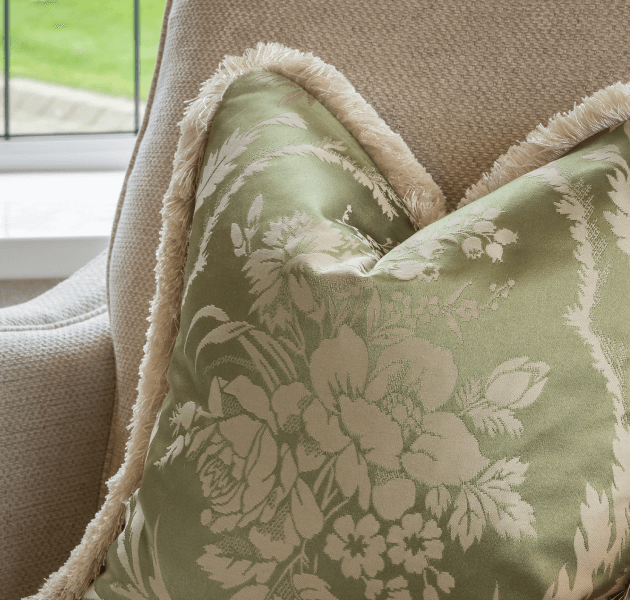 Replacing the previous straight sofa with two “Amelia” armchairs by Duresta opened up the room, highlighting the generous scale of the bay in a way it never had before. Using soft greens and blues as the foundation of the colour palette, complemented by accents of navy, chocolate, and cream, created a harmonious balance of fresh and airy, yet subtly moody to connect with the adjacent rooms. Heathfield lighting provides a gentle, atmospheric backdrop to the scheme, offering the client a range of lighting options to enjoy the room at any time. The result is a calm, inviting space that feels effortlessly refined and beautifully connected to the rest of the home.